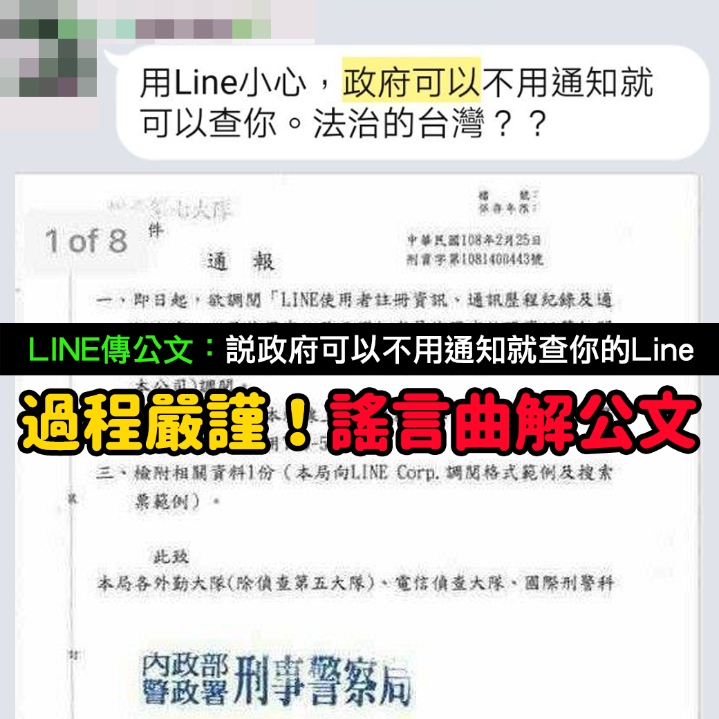 最近 LINE 傳一張公文,說調閱相關 LINE 使用者註冊資訊、通訊歷程紀錄及通訊內容,搭配訊息說「政府可以不用通知就查你的 Line」。實際上這是曲解的謠言訊息,刑事局和 LINE 官方都有作出解釋,向法院聲請調閱相關電磁紀錄過程十分嚴謹,LINE 官方也表示無論是何種形式,都不會單方面配合調閱資料。
